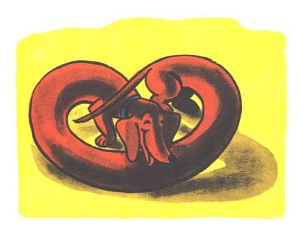 El primero cuenta la historia de un perro salchicha que tiene una longitud sorprendente (es tan largo que puede adoptar la forma de ese bollo salado de origen animal que le da nombre). Todo el mundo lo admira porque, como bien se dice en el libro, cuanto más largo es un perro salchicha, mejor perro es. Bueno, no todos, pues Greta, otra perra salchicha de la que está enamorado, no cree que lo sea. Pretzel intenta por todos los medios sorprenderla, pero nada, ella rehúsa una y otra vez casarse con él. Hasta que un día...